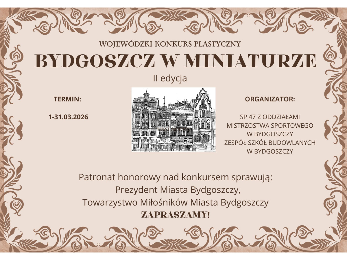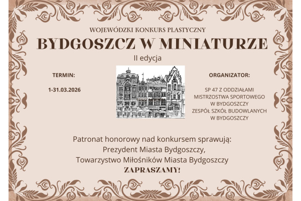 Zachęcamy do udziału uczniów klas 4-8 SP w wojewódzkim konkursie plastycznym pt.: "Bydgoszcz w miniaturze", zorganizowanym pod patronatem Prezydenta Miasta Bydgoszczy oraz Towarzystwa Miłośników Miasta Bydgoszczy.